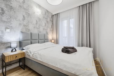 Wnętrze urządzone zostało w jasnych, stonowanych barwach z elementami drewna i eleganckimi detalami. Salon z rozkładaną sofą i telewizorem Smart TV połączony jest z w pełni wyposażonym aneksem kuchennym — idealnym do przygotowania posiłków. Sypialnia z dużym, wygodnym łóżkiem zapewnia komfortowy sen, a nowoczesna łazienka z prysznicem typu walk-in dodaje całości hotelowego charakteru.